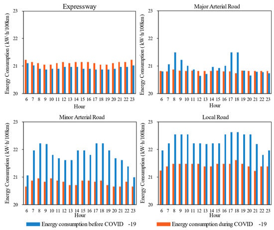 The energy consumption of EVs by hour is shown in Figure 9. Several key findings can be observed. (1) During the pandemic, the implementation of lockdown policies led to an increase in the road network’s average speed. As a result, EVs exhibited reduced energy consumption on non-expressways, while their hourly energy consumption on expressways showed an opposing trend, with an increase. (2) Throughout the COVID-19 period, EVs demonstrated energy consumption changes of −1% (increase) on expressways, 1% reduction on major arterial roads, and 4% reduction on both minor arterial roads and local roads, respectively. (3) The sensitivity of EV energy consumption to average speed was significantly lower than that of CVs.