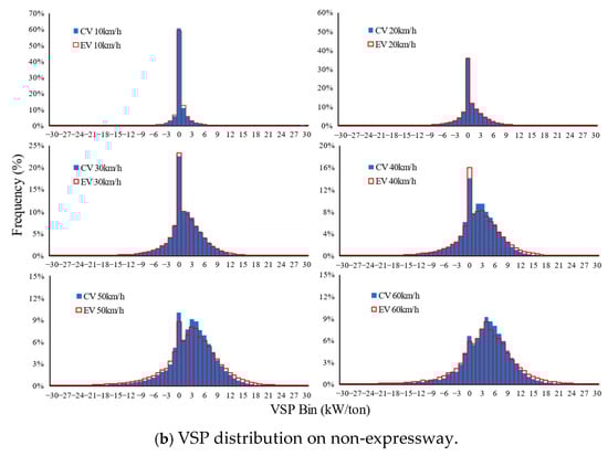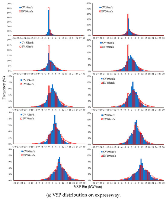 Although the distributions of EVs and CVs have a similar trend, there are still some interesting differences that could be observed. For EVs, the percentage of the 0th VSP bin is higher than CVs on the expressway when the speed is less than 50 km/h. Taking the average travel speed of 10–12 km/h as an example, the percentage of the 0th VSP bin is 61.2% for EVs and 55.7% for CVs. Typical traffic behavior of VSP values around 0 is idling (only for CVs) or queuing for congestion.