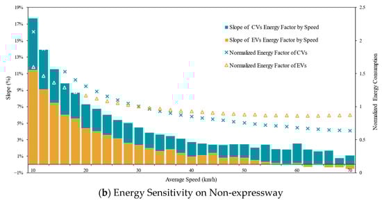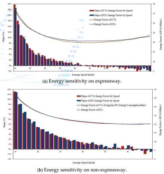 The results indicate that the energy consumption factor–speed curves of CVs and EVs nearly coincide under these conditions. The line graph of energy factor against speed is shown in Figure 11a for EVs and CVs, respectively. Additionally, the slope of the energy factor–speed curve, which can be used to describe the energy consumption sensitivity against speed, is presented with a histogram in Figure 11b. Several results could be observed: