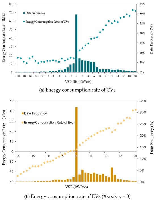 Previous studies revealed significant dispersion in ECR under identical VSP conditions, attributable to heterogeneous driving behaviors and battery thermal transients. To establish deterministic VSP-ECR correlations, we implemented a stratified binning protocol through Equation (6), segmenting the VSP continuum into 1 kW/ton intervals (−30 ≤ VSP ≤ 30 kW/ton). This threshold encapsulates 98.2% of observed operational regimes while excluding extreme recuperation/acceleration outliers (<1.8% occurrence).