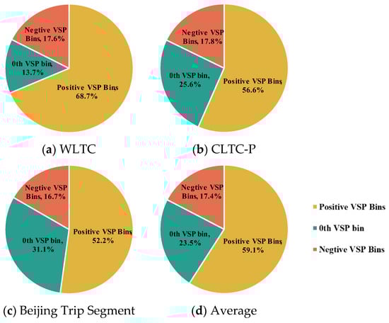 In negative VSP bins, the energy consumption for EVs is negative, which means the motor charges the battery during braking. The percentage of energy consumption discrepancy of positive, 0th, and negative VSP bins for the three trips is shown in Figure 13. Take Figure 13d as an example.