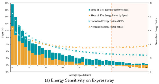 EVs exhibit non-monotonic energy consumption patterns across the studied speed range [10, 90) km/h—a domain selected based on urban road operational objectives where target speeds rarely exceed 90 km/h. As shown in Figure 6a, three distinct regimes emerge: (1) In low-speed conditions [10, 40) km/h, energy consumption decreases with speed (average slope = 4.3%/km·h−1), reflecting reduced idling losses. (2) Between 40 and 70 km/h, consumption stabilizes (slope = 0.3%/km·h−1), indicating balanced efficiency trade-offs. (3) At higher speeds [70, 90) km/h (shaded region), aerodynamic drag dominates, reversing the trend to a positive energy-speed relationship (slope = −0.5%/km·h−1). In contrast, CVs demonstrate monotonic energy reduction across all speed ranges, with phase-specific slopes of 7.3%/km·h−1 ([10, 40) km/h), 2.0%/km·h−1 ([40, 70) km/h), and 0.6%/km·h−1 ([70, 90) km/h). This divergence is most pronounced below 40 km/h, where the CVs’ steeper decline (7.3% vs. 4.3%) underscores their inefficiency in low-speed transient operation. Notably, within the non-expressway speed limit ([10, 70) km/h), energy sensitivity shows no statistically significant variation between expressway and non-expressway driving conditions, suggesting road-type independence of the energy–speed relationship.