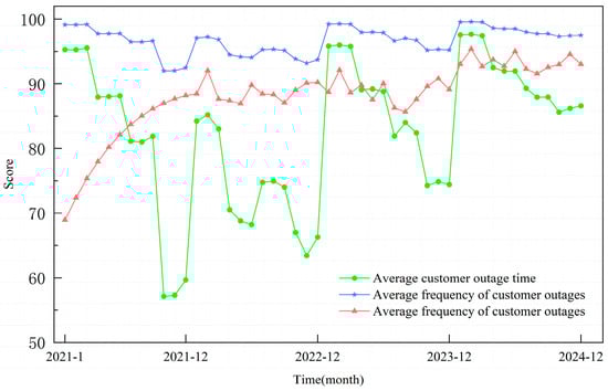 where indicates the score of the average customer outage time indicator; indicates the worst value of the indicator; indicates the best value of the indicator; indicates the actual value of the indicator; and indicates the average duration of customer outages during the month (hours/household). The formula is shown in Equation (13):