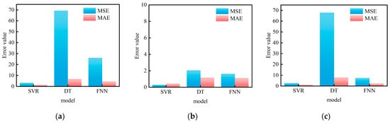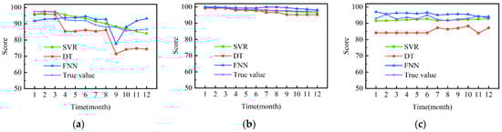 Multi-model prediction accuracy comparison of three secondary indexes under the index group of “Enterprise power efficiency”: (a) Average customer outage time; (b) Average frequency of customer outages; (c) Average cost of electric service to customers.