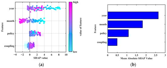 Using the SHAP method, the SVR model is constructed using the best combination of hyperparameters after Bayesian optimization, and the feature contributions of the three secondary indicators , and are calculated, and the distributions of the influence of the features of the three indicators on the target value are visualized, as shown in Figure 7, Figure 8 and Figure 9 (Figure 7, Figure 8 and Figure 9 respectively show the contribution degrees of each feature in indicators , and calculated by the contribution degree analysis model constructed based on the parameters in Table 4 and the method of Section 3.3. “SHAP Value”). In general, the influences on the changes of the AEI are, in descending order, time series feature, coupling feature, and policy feature, respectively.