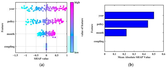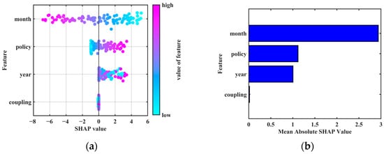 The results of the comparison of SHAP values of each feature in Figure 7 show that the influence of each feature on the indicator is, in descending order, the temporal feature (month), the temporal feature in (year), the policy feature, and the coupling feature. The reason for this is that, first of all, the average customer outage time indicator is mainly affected by the professional degree of maintenance personnel and the level of power supply infrastructure, which is a factor that accompanies the change in time. Moreover, the time span of the year is larger than that of the month, and the influence on the above time factors is also larger, so the influence of the time series feature (year) is slightly greater than that of the time series feature (month). Secondly, as the country is committed to the improvement in maintenance personnel’s professionalism and the upgrading of power equipment, many relevant policies have been introduced also have a non-negligible impact on the change in the average outage time of customers. Of course, outage time is also affected by outage frequency, but not as influential as other characteristics.