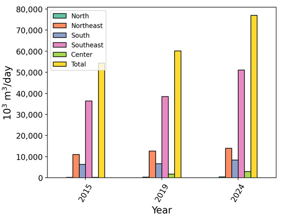 Total Brazilian natural gas consumption in 2015, 2019, and 2024 classified by region. Adapted from [20].