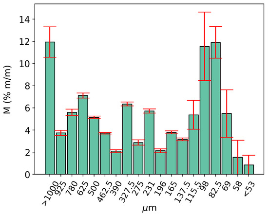The dolomite used in this study was from Piracicaba, São Paulo, Brazil, extracted from ground sedimentary dolomite rocks. It was selected due to Piracicaba’s strategic location, with convenient access to major routes in São Paulo, which could support future applications. The sample was prepared using quartering, to prevent variations in granulometric distribution between samples. The dolomite, comprising 356.49 g, was separated into seven samples having 50 g in mass [45] each, which were weighted on a SHIMADZU BL3200H semi-analytical scale, Kyoto, Japan. Seven samples of different particle sizes were separated, using 18 consecutive sieves of varying mesh sizes, ordered from the largest (>1 mm—top) to the smallest (<18 µm—bottom). Replicates were used to assess the deviation of results. Figure 2 shows the particle size distribution of the dolomite: