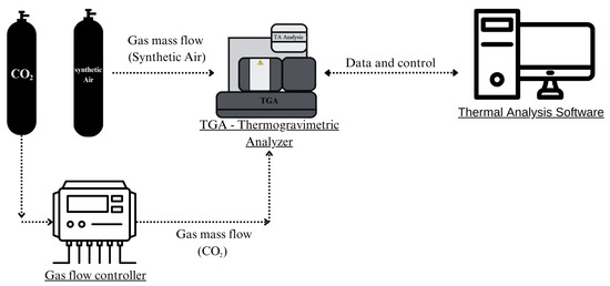CaL tests were conducted on a TA Instruments (SDT Q600) simultaneous thermal analysis system, New Castle, Delaware, USA (TGA-DTG-DSC). TGA systems offer excellent control over temperature, heating rate, and atmosphere, typically working with small samples and having high mass precision, making them ideal for small-scale experiments. The carrier gas was introduced through its main inlet and the reagent gas was injected by means of an Aalborg flow controller (GFC-17), Orangeburg, NY, USA through its side inlet. Figure 3 illustrates the experimental setup used.