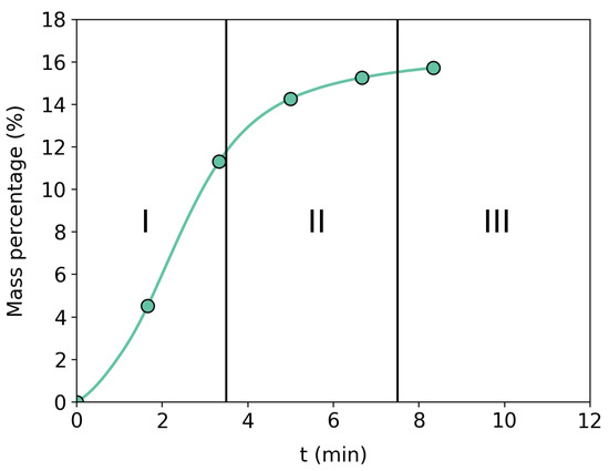 Figure 4 shows an example of the behavior of a carbonation reaction for an evaluated sample. It is possible to observe that carbonation has three well-defined regions. The methodology proposes that the mass capture-to-energy ratio used in regions I and II should be greater than that in region III.