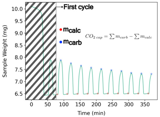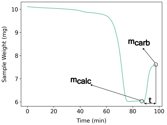 The calcined mass () and carbonated mass () were recorded from the TGA weight signal, as illustrated in Figure 5, and the mass () could be calculated by Equation (3):