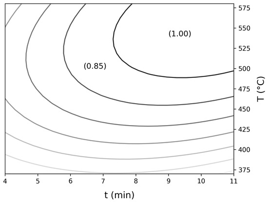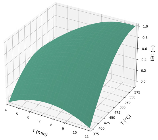 It is possible to observe a curved response surface, indicating a region of maximum response for IEC. The contour lines allow identifying the peak region with greater precision, which was located between 7.3 and 11 min and between temperatures of 490 and 580 °C.