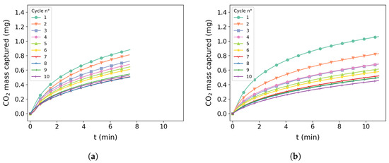 Figure 9a,b present the cycles for tests 5 and 10, respectively. It is possible to observe in both images that there was great capture performance in the first cycle and loss of efficiency in the following cycles with a slight difference on the degradation pattern during each cycle. Figure 10a shows test 2 for the cycle condition presenting a slight initial capture of around 0.4 mg and similar degradation behavior of other conditions.