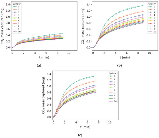 Figure 10b,c shows tests 4 and 12, respectively. A similar performance with mass capture above 1.2 mg can be observed for both tests. A similar pattern of degradation can be seen with a slight difference on test 12 after the fifth cycle.