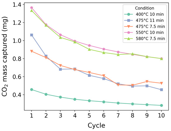 Multicycle tests were conducted, using the previous experimental setup. After the first cycle, the atmosphere was switched to synthetic air, and the temperature was again raised to 800 °C at a rate of 20 °C/min, to reduce the total time spent during the tests, followed by going through the carbonation stage once more. A total of ten complete calcination/carbonation cycles were performed.