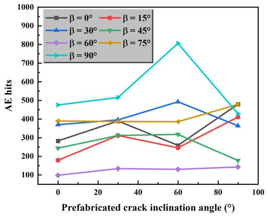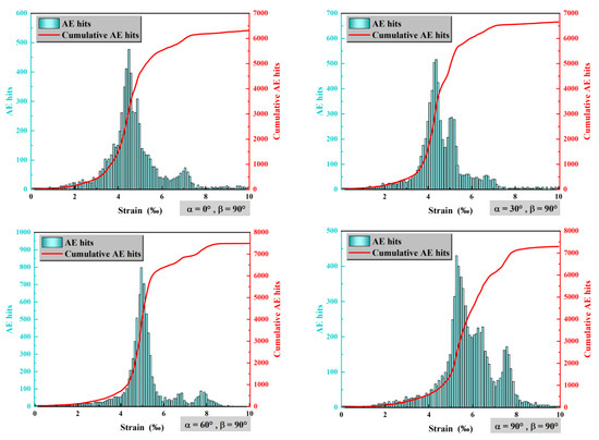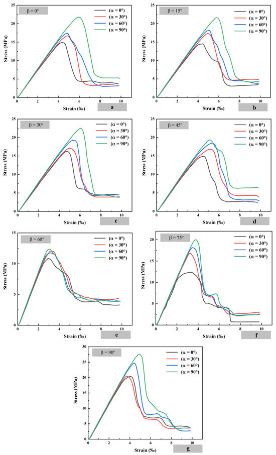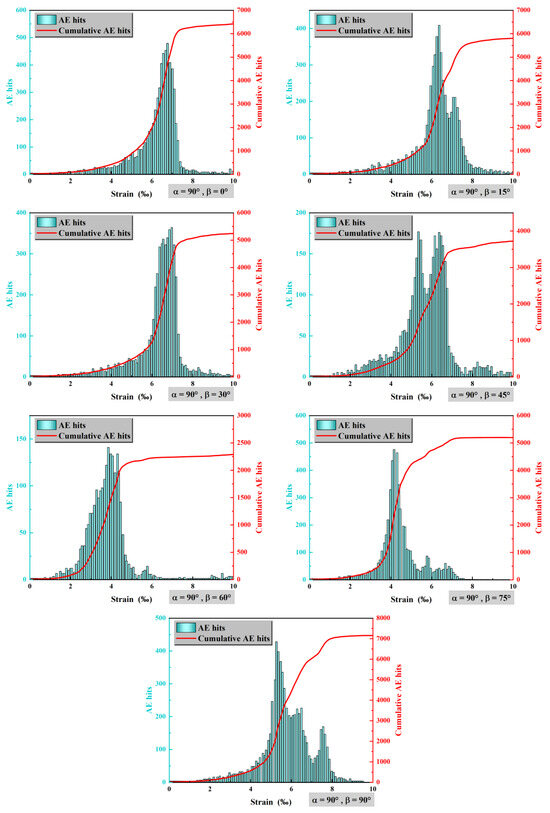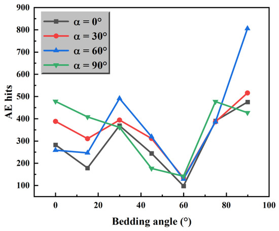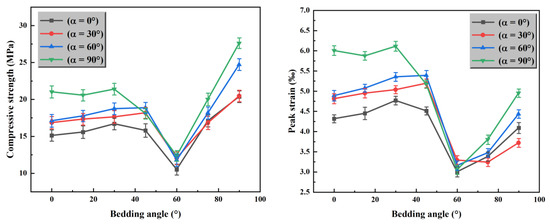 | Bedding Plane Angle (β) | Fracture Angle (α) | Peak Compressive Strength (Relative) | Peak Strain | Cumulative AE Count (If Specified) | Fracture Behavior Description |