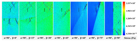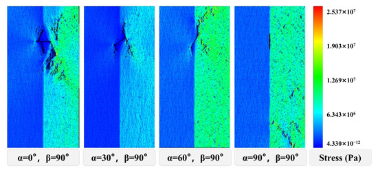 - The orientation of the pre-existing fissure has a profound impact on the mechanical behavior of the composite. Specifically, when the fissure is oriented near 0°, the crack tends to coalesce at a lower stress level, leading to an early onset of extensive damage characterized by wide-spread microcrack connectivity. In contrast, when the fissure is oriented near 90°, the simulation results indicate a significant delay in the propagation of cracks, thereby increasing the composite’s capacity to sustain higher loads before failure occurs. The alignment of fissures relative to the loading direction plays a critical role in determining the overall structural integrity, as it influences the stress distribution and the subsequent energy release during fracture.