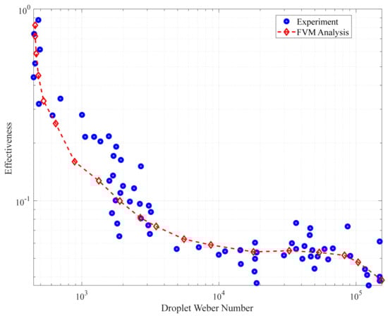 When a subcooled droplet impacts a surface heated above the Leidenfrost temperature (Figure 1), the parameter ε, spray effectiveness, describes how efficiently the spray removes heat. It expresses the ratio of the actual heat removed by the spray to its maximum possible heat removal, which includes both the latent heat and sensible heat of the liquid. This parameter serves as a measure of the spray’s overall heat transfer efficiency. The effects of the droplet Weber number on spray cooling effectiveness are illustrated in Figure 2, which presents a comparison between experimental data from the literature and the results of our FVM simulations. The FVM model was developed to replicate the heat transfer behavior under varying spray conditions and to validate experimental observations through numerical analysis. Data in the figure were collected from several published studies [29], encompassing a wide range of conditions. The mass fluxes ranged from 0.016 to 2.05 kg/m2s, with droplet velocities between 0.6 and 7.3 m/s, and droplet diameters from 0.13 to 25 mm. To ensure consistency in boundary conditions between the experimental data and the FVM simulations, all heat transfer analyses were conducted at a surface temperature of 400 °C. The FVM simulation results show good agreement with the experimental trends. Both sets of data demonstrate a general decrease in spray cooling effectiveness as the Weber number increases. Notably, there is a distinct drop in performance at approximately We = 80. This behavior is consistent with the findings of Yao and Cox [29], who reported a shift in droplet dynamics when impacting non-wetting surfaces at similar Weber numbers.