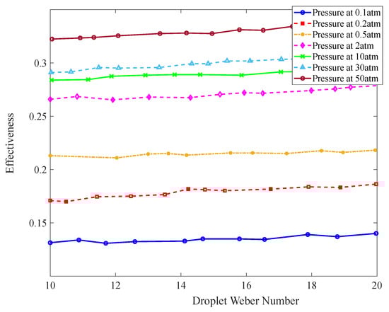 Variations in the heat transfer efficiency parameter (ε) of the droplet as a function of the Weber number across a pressure range of 0.1 to 50 atmospheres.