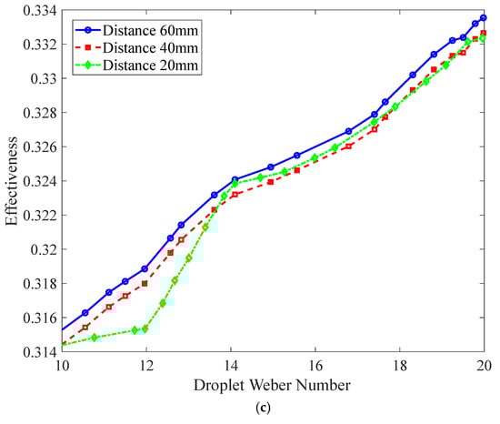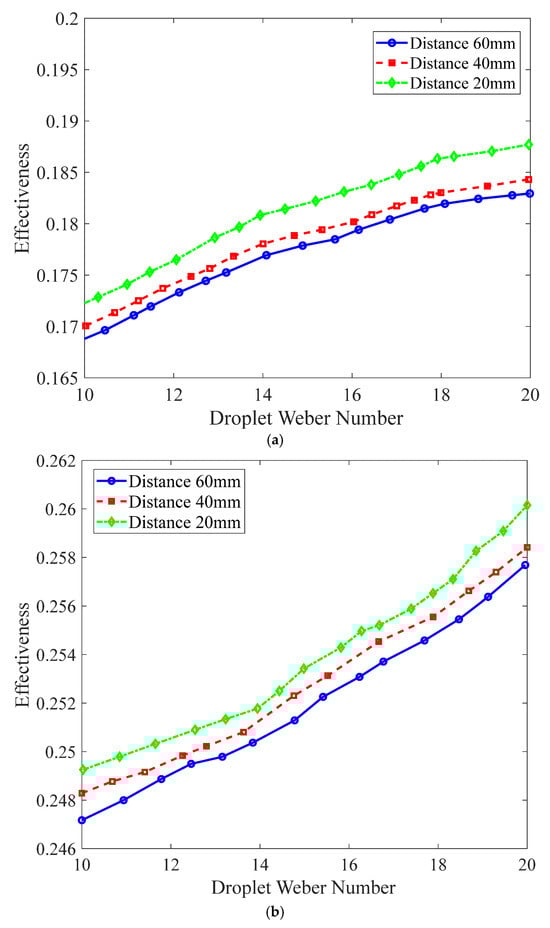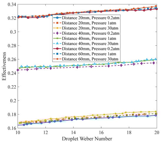 The simulation of the droplet under identical conditions was analyzed for different spray distances from the surface. The heat transfer efficiency parameter was evaluated for a droplet at a pressure of 30.2 atm, with spray distances of 20 mm, 40 mm, and 60 mm from the surface. In both examined cases, the Weber number of the droplet is within the range 10 < We < 20. In each of these cases, as the Weber number increases, the kinetic energy impact relative to the droplet’s surface tension also increases, leading to an enhanced heat transfer efficiency parameter. However, as the spray distance increases, the rate of decrease in heat transfer efficiency becomes less pronounced. The air mass in the spray environment causes the droplet to deviate from its vertical trajectory toward the center of the surface. Due to the presence of this air mass, the vertical velocity component of the droplet decreases as the spray distance increases, while the tangential velocity component increases. This shift reduces the droplet’s heat transfer capability, lowering the heat transfer efficiency parameter.