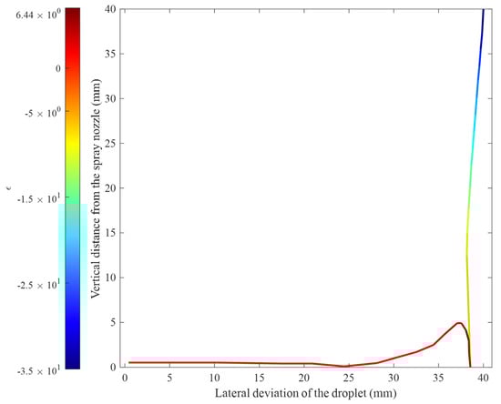 Figure 11 presents the trajectory of a sprayed droplet at a pressure of 10 atm. As observed, the droplet undergoes a slight deviation from the center of the surface while traveling from the spray point to the impact area. A comparison with Figure 8, Figure 9, Figure 10 and Figure 11 indicates that the droplet’s deviation at 10 atm is noticeably smaller than at lower pressures. The increase in ambient pressure enhances air resistance, which helps to stabilize the droplet’s path and reduce lateral displacement. Moreover, after rebounding from the surface, the droplet moves back toward the surface and impacts it again. At 10 atm, the distance between the first and second impact points is shorter compared to the case at 1 atm, suggesting that the droplet loses more kinetic energy upon impact, resulting in a less pronounced rebound and a quicker return to the surface.
