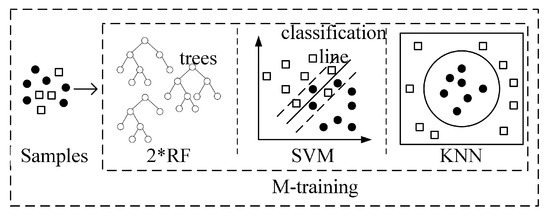 In the original feature space, if the data is not linearly separable, i.e., it is not possible to completely separate different classes of data points by a linear hyperplane, the SVM can map the data to a higher dimensional space through a kernel function to make the original data linearly separable in this higher dimensional space [21]. Therefore, using SVM as a base classifier can improve the M-training algorithm’s ability to handle nonlinear data. However, SVM classifies the dataset by means of support vectors, which also leads to the fact that SVM is more sensitive to noise and outliers. RF is more robust to noise and outliers due to the integration of multiple decision trees [22], and RF is more suitable for dealing with large-scale datasets compared to SVM. Therefore, combining RF with SVM not only improves the algorithm’s ability to handle noise in data but also improves the M-training algorithm’s ability to handle data of different sizes.
