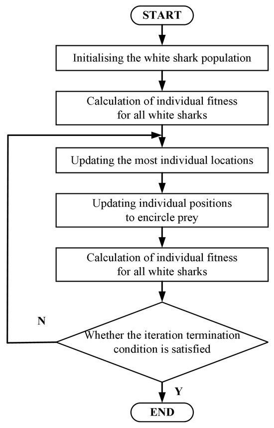 For the key parameters in each of the above base classifiers, this paper adopts WSO, the core idea of which is to mimic the special hearing, olfactory and fish behavior of white sharks when tracking and foraging and mathematically model the hunting characteristics of the white sharks, searching for and exploiting each potential region in the space in order to achieve parameter optimization. The specific hyperparameters of the algorithm are configured as follows: population size of 50, maximum iterations of 100, and olfactory sensitivity coefficient of 0.8. These parameter settings are referenced from the convergence experiments in [24]. Detailed mathematical models and formulations of the algorithm can be found in [24], with the specific workflow illustrated in Figure 2.