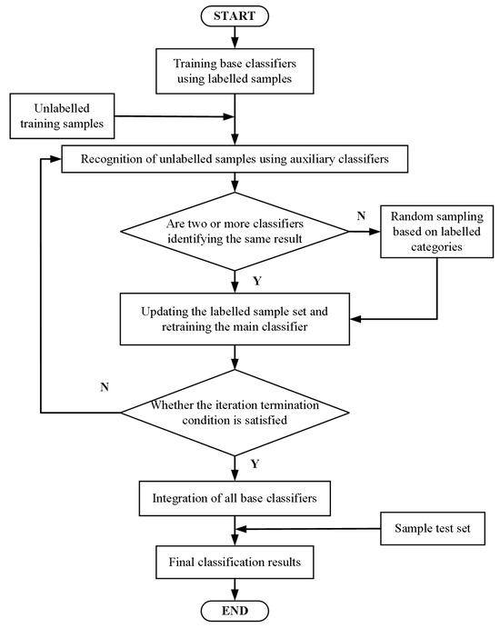 There are N base classifiers in the M-training algorithm, denoted as ci, i = 1, 2, 3, … N, where N is a positive integer and N > 3. Let L denote all the labeled samples in the initial sample set, and |L| denote the total number of labeled samples. Let U denote all unlabeled samples in the initial sample set, and |U| denote the total number of unlabeled sample sets.
