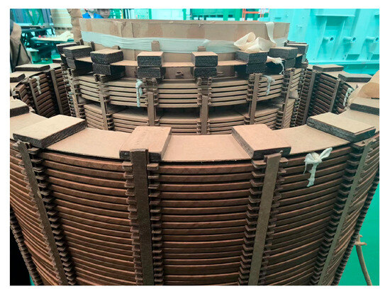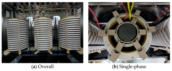 In order to study the transformer winding fault identification method based on the frequency response method, this paper utilizes an experimental transformer with a voltage level of 10 kV, and the internal structure of the transformer is shown in Figure 4. From outside to inside, there are 16 cakes of high-voltage windings, 16 cakes of low-voltage windings and the iron core, and each cake of the high-voltage and low-voltage windings consists of 32 turns and 16 turns of coils, respectively, which are separated by pads to separate the wires from the cakes.