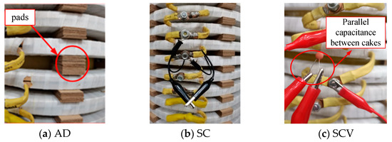 When the transformer windings are twisted, bulging, and other deformations occur, the spacing between the wires and cakes is reduced, resulting in a larger longitudinal equivalent capacitance between the winding cakes [26]. The longitudinal equivalent capacitance of the model transformer can be obtained at the level of 100 pF based on the calculation method of the literature [26]. In this paper, different degrees of SCV are simulated by connecting capacitors ranging from 220 pF to 680 pF in parallel between the winding wires and cakes, which are implemented as shown in Figure 5c, and different degrees of SCV are simulated at the top, middle, and bottom of the windings, which are set up as shown in Table 3.