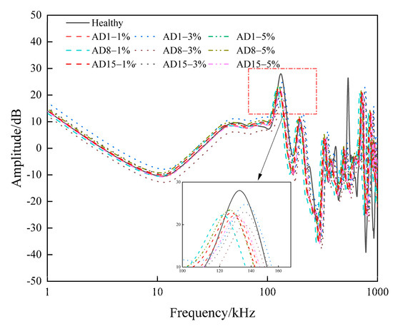 Figure 6 shows the frequency response curve of AD under different fault degrees and fault locations; the amplitude of the curve in the frequency band 1~100 kHz is basically not fluctuating; the curve in the frequency band 100~500 kHz is shifted downward as a whole, and the degree of shifting becomes smaller with the increase of frequency; the curve in the frequency band 800~1000 kHz fluctuates markedly, which is specifically reflected in the decrease of the amplitude of the peaks and valleys of the high-frequency band; and it can be seen that with the aggravation of the degree of AD, the curve also tends to move to the low-frequency band. The detailed figure shows that with the increase in AD, the curve also shows a tendency to move to the low-frequency band.