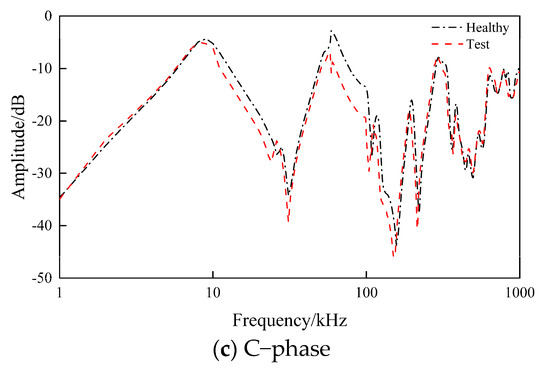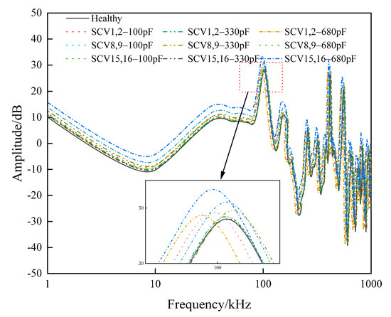 Figure 7 shows the frequency response curves under different fault degrees and fault locations of SC, and the curves are shifted in the whole frequency range; the curve in the frequency band 1~100 kHz shows an upward shift, and the valley of the band at 10 kHz as well as the peak of the band at 80 kHz are shifted to the high-frequency band; the curve in the frequency band 100~500 kHz is upwardly shifted overall, and the extent of the shift increases with the increase of the degree of SC. The curve in the frequency band 100~500 kHz is shifted upward, and the degree of shift increases with the SC degree, which has a better resolution of the fault degree; the curve in the frequency band 500~1000 kHz fluctuates a lot, and there is a tendency to shift to the high-frequency band on the basis of the upward shift.