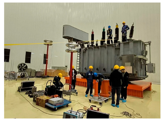 This paper takes a 110 kV power transformer of Yunnan Power Grid as the main research object, as shown in Figure 10, and the specific parameters of this transformer are shown in Table 9. Due to the presence of a substation in the vicinity, the SNR for ambient noise at the site is approximately 15 dB. The high and medium voltage windings are in star wiring mode, and the low voltage windings are in triangular wiring mode. The high, medium and low voltage windings are tested separately, and the test program for the low voltage side is A injection B test, B injection C test and C injection A test; the test program for the high and medium windings is: take the O point as the signal injection point, and collect signals in the three phases of A, B and C, and name the collected signals through the file naming provisions in the IEC 60076-18-2012 [5].