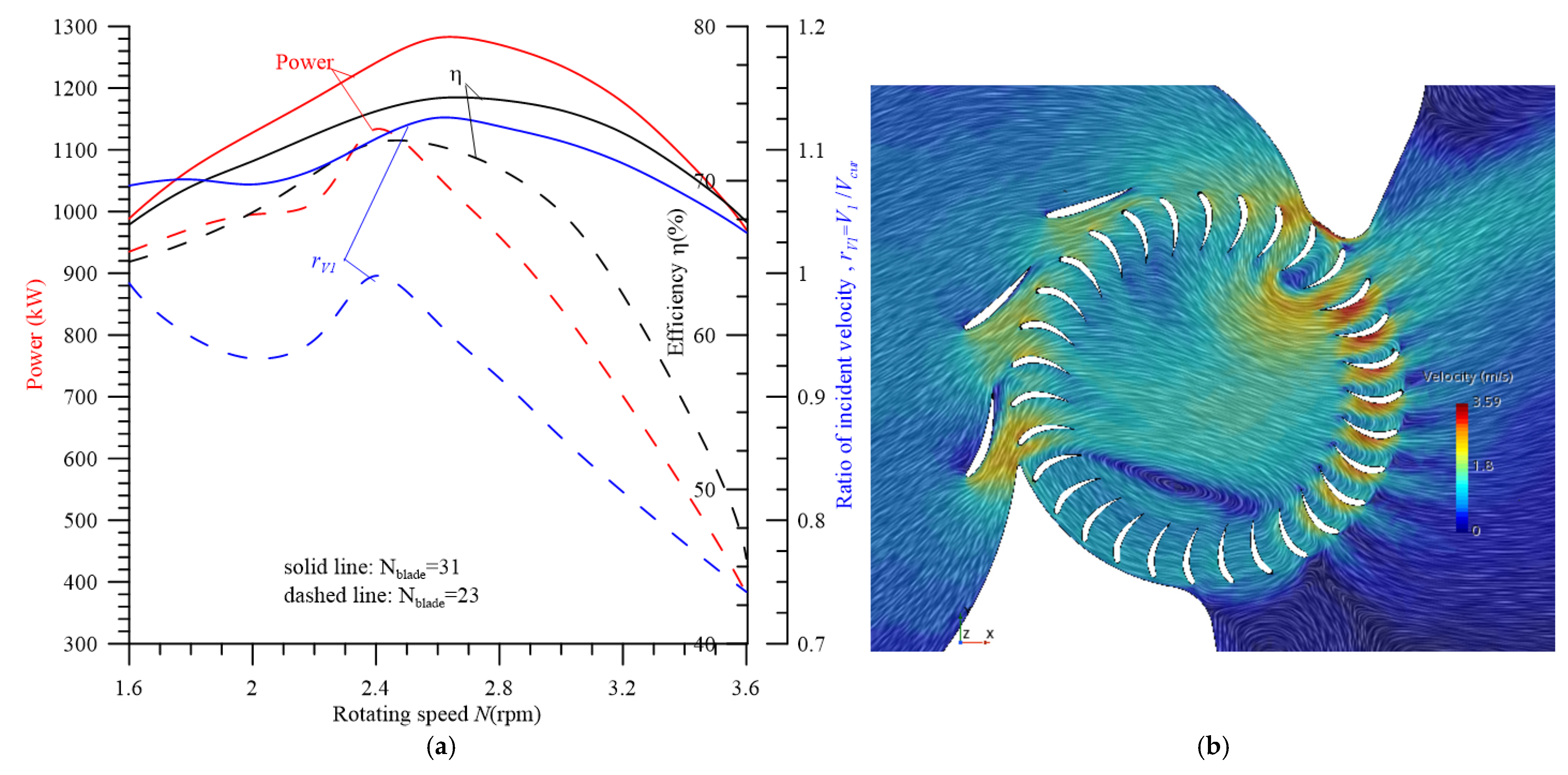 - If the rotating speed N = 2.6 (Vcur/1.6) rpm is considered, the power, efficiency η, and incident velocity ratio rV1 for any current velocity Vcur are significantly high. Moreover, whatever Vcur is, the corresponding efficiency η is approximately 77.5%.