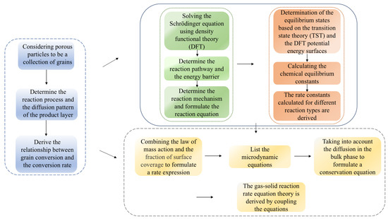 The selection of various kinetic models can significantly influence the kinetic parameters derived from reaction data. Habermann et al. [78] divided the reduction reaction of iron ore into two phases using a fluidized bed reactor: a first phase controlled by gas phase diffusion and a second phase dominated by the reduction reaction within the iron ore. Zhu [79] obtained the kinetic parameters of three models by choosing three different models at the same temperature. Mei et al. [80,81] researched the reaction between Fe2O3/Al2O3 and CO by dividing the reaction into two stages by converting the conversion rate, thus obtaining a mechanism model that was adapted to different stages. Ksepko et al. [82] determined the kinetic parameters of Fe2O3/TiO2 using three different models to obtain different kinetic parameters. Monzam et al. [83] proposed a kinetic model based on two parallel reactions to describe the reduction of Fe2O3 to FeO; however, this model was constrained by CH4 concentration and temperature conditions. Su et al. [70,84] examined the reduction kinetics of hematite with CO using TGA and a small-scale fluidized bed reactor. They found that the reduction of hematite occurs in two stages (Fe2O3 → Fe3O4, Fe3O4 → FeO), with the first stage being controlled by gas diffusion and the second stage by chemical reaction. Piotrowski et al. [85,86] researched the kinetics of the reduction reaction of hematite with syngas and obtained activation energies in the range of 25–125 kJ/mol using a two-dimensional nucleation and nuclei growth model. Consequently, for redox reactions, different models are required due to the different ways in which the structure of the solid particles changes. Notably, Li et al. [87,88] successfully predicted the kinetics of CaO carbonation under diverse experimental conditions by formulating a general rate equation theory. The approximate flowchart is shown in Figure 2. Moreover, based on the general rate equation theory, his team successfully predicted the H2 and CO reduction kinetics of CaMn0.775Ti0.125Mg0.1O2.9-δ at different temperatures and concentrations by applying the transition state theory and density functional theory. They also predicted the reduction kinetic of Fe2O3 with H2 at different temperatures and concentrations [89,90].