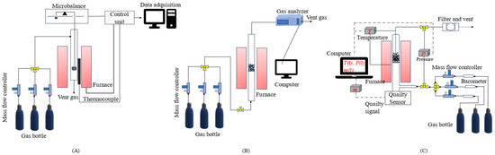Schematic diagram of experimental equipment: (A) TGA; (B) MFB; (C) FB-TGA.