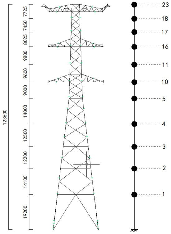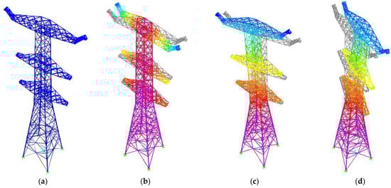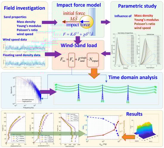 Using the developed model, we simulated the dynamic behavior of a power transmission tower subjected to combined wind and sand loads. The simulations revealed that the interaction between wind and airborne sand particles amplified structural responses compared to wind-only scenarios. Specifically, key metrics such as tower-top displacements, acceleration amplitudes, and internal axial forces in primary structural elements exhibited substantial increases. Under conditions of elevated sand density, for example, the peak displacement at the tower apex rose by 28%, highlighting the critical importance of accounting for wind–sand coupling effects in both the design phase and safety assessments of transmission towers, especially in regions prone to sandstorms;