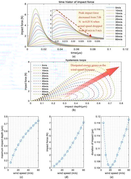 The parametric study results reveal that the wind speed, sand particle density, and elastic modulus had substantial effects on the impact process. Higher wind speeds and sand particle densities led to increased peak impact forces and deeper penetration depths, whereas higher elastic moduli resulted in greater energy dissipation through elastic rebound rather than plastic deformation. Notably, the peak impact force increased by up to 66.7% with higher sand density and by 148% with higher elastic modulus, highlighting the importance of considering these parameters in structural design;