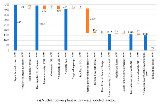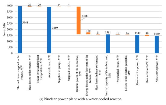 The results of modeling the basic schemes of NPPs with water-cooled and liquid-metal reactors showed that the net electric power generated by the cycle was 925 and 277 MW, respectively. The values of the net efficiency of the cycles were 31.52 and 39.24%, respectively, for the water-cooled and prospective liquid-metal reactors. The obtained efficiency estimates for the considered cycles are comparable with the data from [30], which indicates that the gross efficiency of such installations is in the range from 34 to 36% and from 41 to 43%, respectively, for PWR and BREST. The reduction of heat balances for the considered plants is shown in Figure 6. During the study, diagrams of the reduction of the heat balance of the turbine plant were also obtained for hybrid thermal schemes of NPPs with different types of plants. The principle of constructing the diagram is as follows: the diagram shows the energy scheme of the nuclear thermal cycle, which clearly reflects the distribution and losses of thermal energy at each stage. The initial thermal power coming from the reactor is transferred to the steam turbine circuit, but the heat reaches the steam generator with losses that occurred during transportation in the first and second circuits, which reduces the power supplied to the working fluid of the cycle. Additionally, energy costs for the operation of auxiliary equipment, such as pumps, are taken into account. The main energy losses occur in the condenser, as well as in the flow part of the turbine, where losses occur due to the internal relative efficiency of the turbine being less than 100%, while energy is additionally lost in the process of heat exchange between the environments in the high- and low-pressure heat regeneration systems of the steam turbine circuit. The total power generated by the turbine is z MW, from which, after subtracting the mechanical losses due to shaft friction and the operation of the oil supply system, as well as electrical losses in the electric generator for its cooling and in its stator windings, as well as energy costs for ensuring the operation of mechanisms for other auxiliary needs of the station, we obtain the absolute net electrical power of the cycle under study.