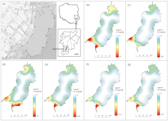 Map of the study area (a). Spatial distribution ERJ of Cr (b), Ni (c), Cu (d), Zn (e), Cd (f), and Pb (g), and counts in the bottom sediments of the lake (black dots).