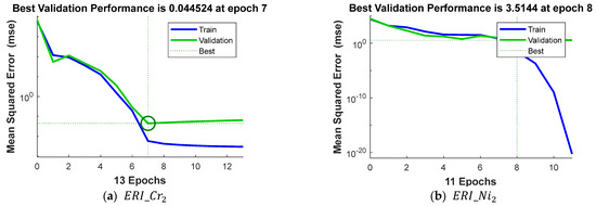In the analysis, the primary determinants included the values of heavy metals such as within the surface layer (input neurons), and the value of the modeled metal in the deep layer served as the output neuron. The modeling process employed a feedforward artificial neural network with a single hidden layer network. The quantity of neurons within the hidden layer was established through empirical methods and varied between 2 and 15. The Levenberg–Marquardt training algorithm was selected for its robustness and efficiency in solving nonlinear regression problems. This algorithm combines the advantages of gradient descent and the Gauss–Newton method, making it particularly effective in minimizing the error function in moderately sized datasets. The hidden layer employed a sigmoid activation function to allow for the modeling of nonlinear relationships between input and output variables, while the output layer used a linear activation function (purelin), appropriate for continuous output variables such as ERI. Owing to the limited input data available, the utilization of a separate test set was deemed unnecessary, leading to the partitioning of the complete data set into the following two distinct subsets: training and validation, following an 80:20 split. Identical training and validation datasets were employed for both the MLR and ANN methods. To mitigate overfitting and ensure generalization, early stopping based on validation performance was implemented during training.