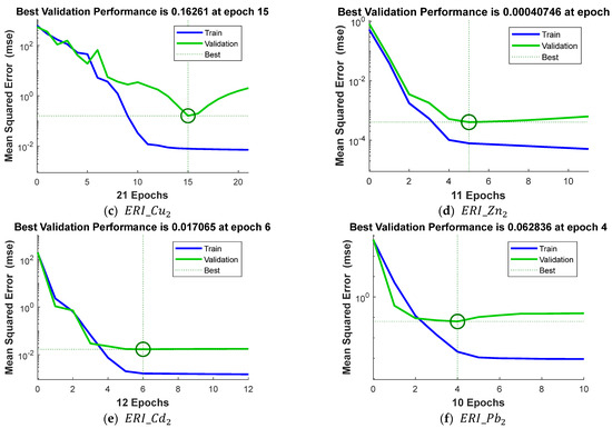 Mean Squared Error (MSE) during model training over examined epochs. Best validation performance for best networks for ERI_(-j) value for heavy metals: (a) b) c) (d) , (e) , and (f) .