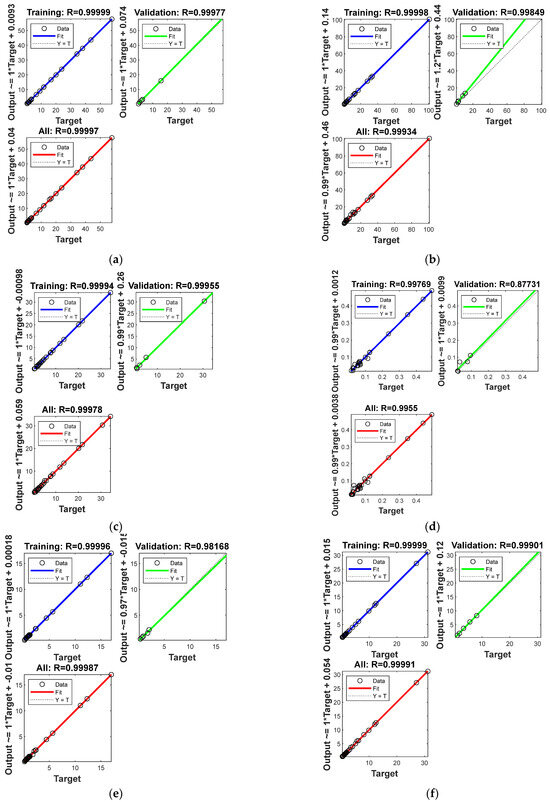 Regression plots for training, validation, and all data sets for individual models for: (a) , (b) , (c) , (d) , (e) , and (f) . The relationship between the expected value (“Target”) and the actual output value of the model (“Output”).