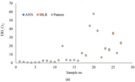 Comparing the results of modeling the ecological risk index values of selected heavy metals , , , , , and using the MLR and ANN methods and evaluating the coefficients of determination R2 of the developed models are shown in Table 8. The comparison selected R2 and MSE as standard indicators to interpret both the MLR and ANN models. This effectively predicted the ecological risk index values of the selected heavy metals.