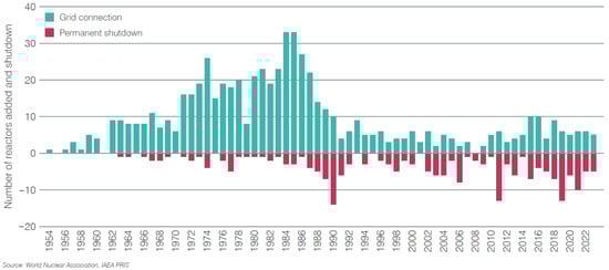 Figure 1 illustrates the trend of new reactor grid connections and shutdowns from 1954 to 2023 [