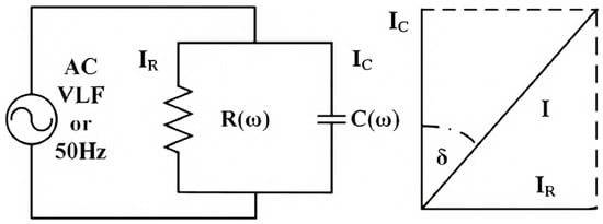 Figure 8, R represents the overall dielectric loss (conduction, polarization, and ionization losses) and C represents the lumped capacitance of the cable insulation. The dissipation factor can be defined as the ratio of the leakage current IR to the capacitive current IC, and their relationship can be derived from Equation (