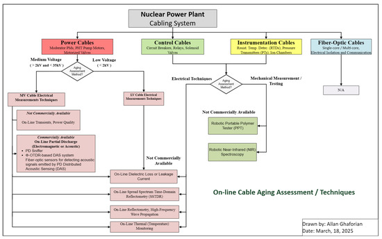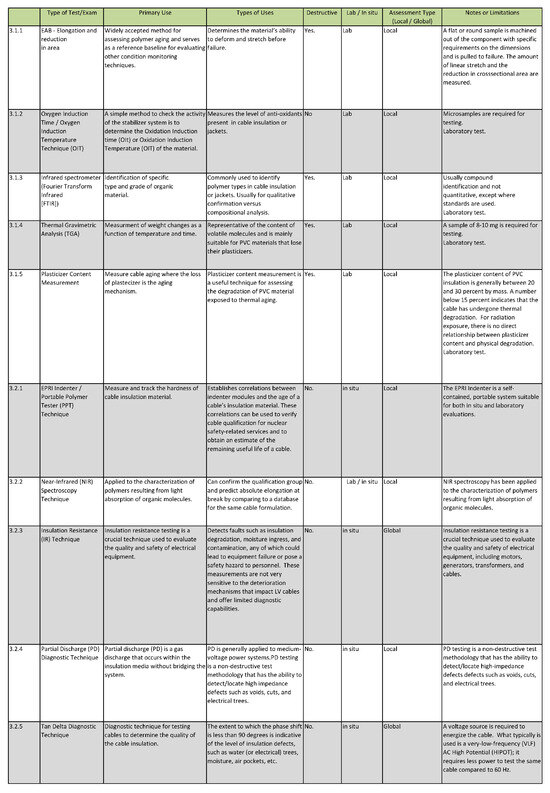 5]. An important, costly, and time-consuming part of reactor refurbishment is verifying the health and integrity of electrical cables to determine if they need replacement. Insulation and jacket materials used for electrical cables are polymers with additives and fillers to improve aging resistance, dielectric, mechanical, and fire-retardant properties. In a nuclear power plant, cables may be subjected to environmental stressors such as high temperature, radiation, humidity, or vibrations during both normal and abnormal conditions that can cause deterioration and ultimately the failure of power, control, and instrumentation cables. While functional tests confirm operational status, they offer limited insight into insulation health or remaining service life, key concerns addressed through condition-based diagnostics. This research provides a timely and comprehensive literature review on both off-line electrical tests of the physical and chemical properties of cables, while they are de-energized and disconnected, and on-line electrical tests and diagnostic techniques while cables are energized and in service. Electrical tests are inherently more attractive, as they offer the potential of assessing an entire cable run rather than a predetermined, accessible area of a cable [