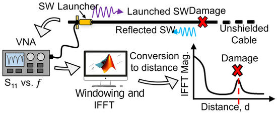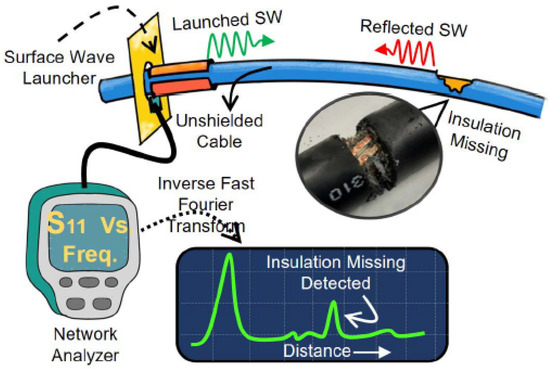 74] proposed both a 1 GHz and a 7 GHz cable that could be used to detect insulation damage in a thick and a thin cable, respectively. They demonstrated that higher frequencies allowed for the detection of damage with smaller resolution, while lower frequencies allowed detection over longer distances, especially for large-diameter cables. The instrumentation utilized a non-conductor-contact surface-wave launcher consisting of a cylindrical monopole, and a ground plane was connected to a vector network analyzer (VNA). A sinusoidal swept frequency broadband signal with an appropriate frequency range was excited between the monopole and the ground plane, which caused the generation of surface waves that propagated along the length of the cable. The surface waves, upon reaching the location of the damaged or missing insulation, were reflected and then subsequently picked up by the SWL technique, as shown in