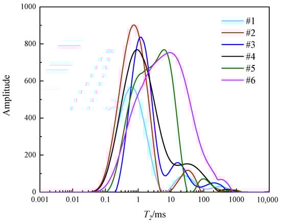 Figure 7 shows a comparison of the nuclear magnetic resonance (NMR) curves of six cores under saturated water and a centrifugal force of 3 MPa. It can be seen from the figure that the curves show a downward trend under centrifugal force, indicating that the water in the cores has been displaced. The curves of Cores 5 and 6 show a significant decrease after 10 ms, suggesting a high degree of water displacement in the macropores. The water saturation after centrifugation was calculated by the nuclear magnetic resonance curves before and after centrifugation, as shown in Figure 8. As seen in Figure 8, the water saturation of the cores gradually decreases with an increase in centrifugal force. At low centrifugal forces, the decrease in water saturation is slower because the initial displacement pressure is insufficient to overcome capillary forces, causing water to remain trapped in the pores. At higher centrifugal forces, water saturation decreases rapidly, indicating that the displacement pressure is sufficient to overcome capillary forces, leading to the expulsion of more water.