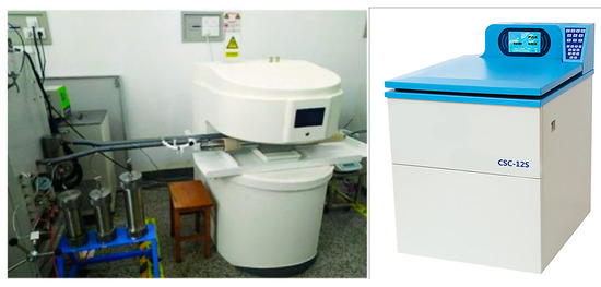 NMR (nuclear magnetic resonance) measurements, specifically the T2 relaxation time, provide additional insights into the water distribution in pores, allowing for a more accurate determination of irreducible water saturation when used in conjunction with the centrifugal method. The centrifuge and nuclear magnetic device were shown in Figure 5. The centrifugal force was gradually increased to remove water from the rock core. At each centrifugal stage, nuclear magnetic resonance (NMR) was used to monitor changes in water content over time. When the water content stabilized and showed no further change under a given centrifugal force, it was considered that the minimum water saturation corresponding to that centrifugal force had been reached. As the centrifugal force continued to increase and the water content in the core remained effectively unchanged, it was determined that the bound water saturation had been reached. At this point, the experiment was concluded. This range of centrifugal forces ensures that water is removed from both macro-pores and micro-pores, allowing for the determination of irreducible water saturation across the full spectrum of pore structures. T₂ spectra of the core samples were obtained at different levels of centrifugal pressure. The shorter T2 values correspond to water in smaller pores, while longer T2 values are associated with water in larger pores. By correlating the T2 values with known saturation values, the irreducible water saturation can be calculated, providing insight into the pore structure and water retention characteristics of the core sample.